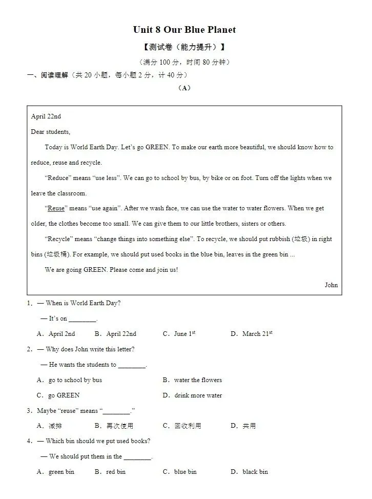 【26年春季新版】七年级下册仁爱版英语Unit8单元知识提升检测,可下载打印!