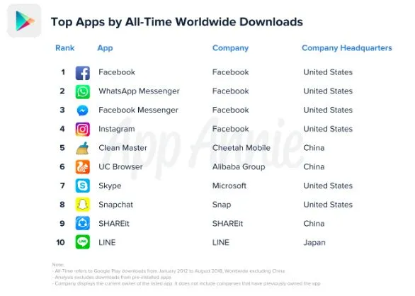 另外,App Annie统计了谷歌应用商店诞生以来的全球热门移动应用,其中UC浏览器、茄子快传、清理大师进入Top 10,与其他六款美国应用及一款日本应用一起构成了过去七年安卓系统全球最热的十款移动应用。