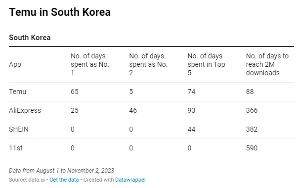 再从霸榜的时间来看,从2023年8月1日至11月2日的93天中,Temu在iOS和Google Paly购物应用每日下载量方面有65天排名第一,超过了速卖通、SHEIN、11Street等多个电商巨头。并且,在韩国市场,Temu仅用了88天就达到了200万次下载量。
