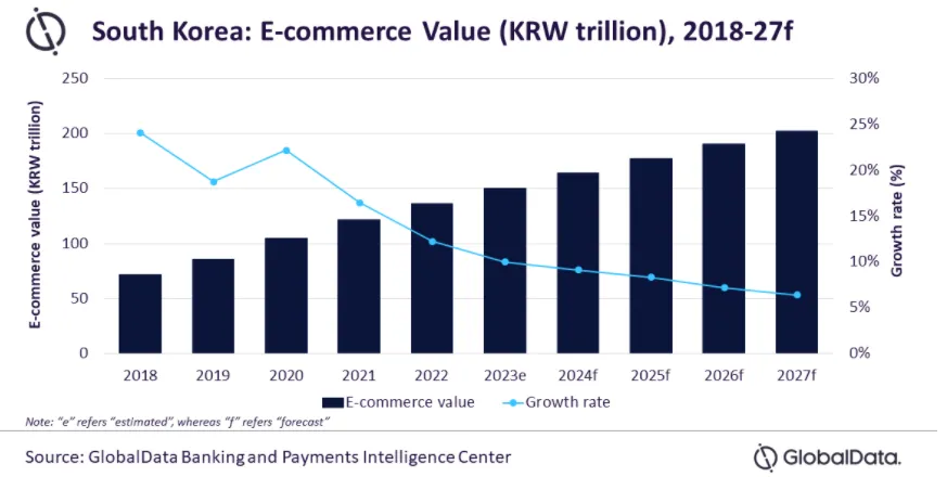 就以韩国电商市场来看,近些年来这一市场的电商潜力正加速释放。数据显示,2022年韩国电商市场规模达到136.6万亿韩元。预计在2023年至2027年期间,市场的复合年增长率将达到7.7%,到2027年市场规模突破202.6万亿韩元。