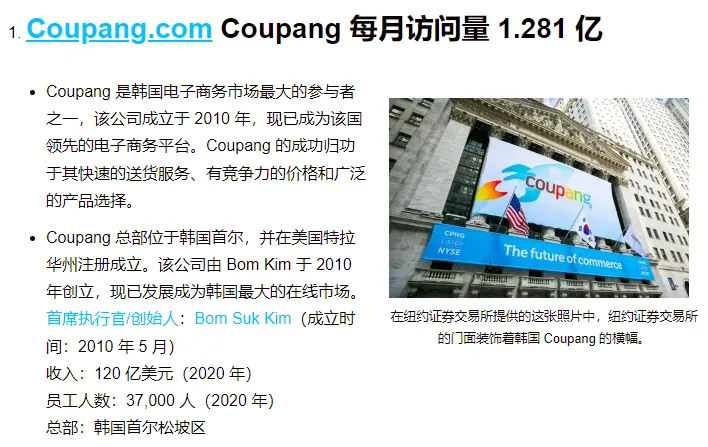 不过目前放眼韩国电商竞技场,占据最大优势地位的还是韩国本土电商Coupang。据统计,Coupang以1.28亿的月访问量在韩国市场断层领先,第二名的NAVER Shopping月访问量仅为8130万,随后是11Street(4000万)。此外,在月平均使用时间、月平均使用次数以及市场份额、月活跃用户数等方面,Coupang都遥遥领先。
