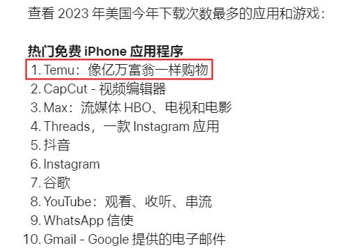 近日,苹果公布了2023年其美国App Store的应用下载量排行榜。在免费应用程序下载量榜单中,拼多多旗下跨境电商平台Temu超越了TikTok、Instagram、Google、YouTube等一系列大热App,强势登顶第一。