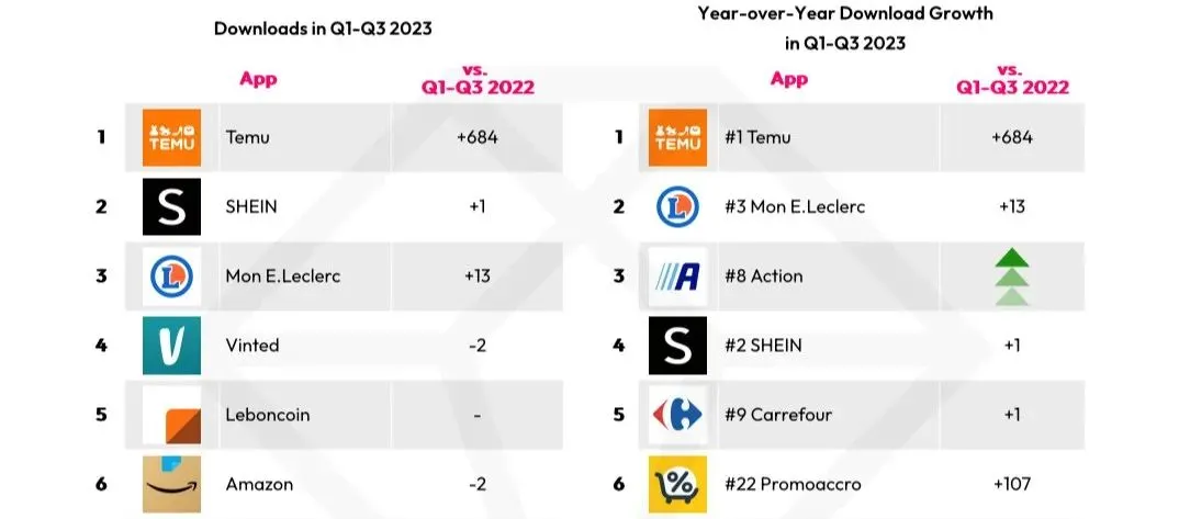 再之后,登顶美国应用程序下载量榜,对Temu来说就成了家常便饭。data.ai的统计数据显示,在今年1月到9月的前三个季度,Temu是美国总下载量最高的应用程序,将老牌电商霸主亚马逊甩在了身后。