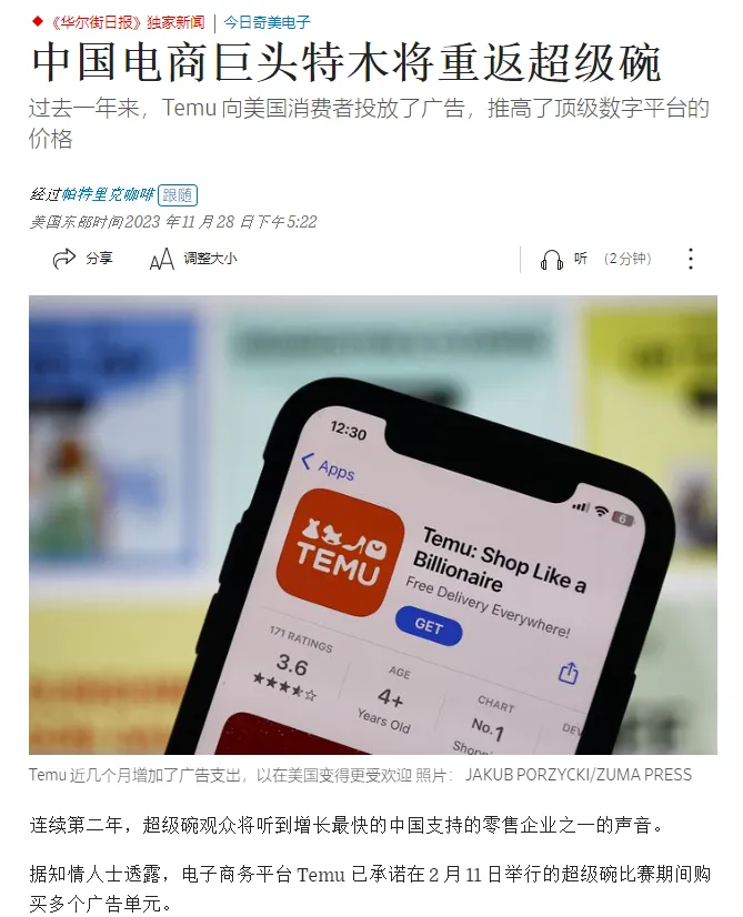而依靠着母公司拼多多的雄厚财力支持,Temu也有底气大搞病毒式营销,不仅在Facebook、Instagram等欧美主流社媒平台上疯狂投放广告,还计划明年再度砸重金登上超级碗打广告,将自己的低价之风吹到更多消费群体中。