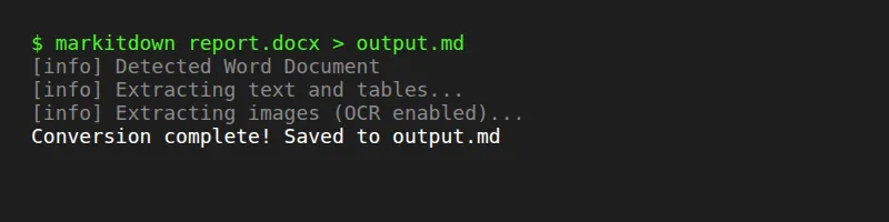 对于开发者来说,MarkItDown 最香的地方在于它提供了极其精简的 Python API 和 CLI(命令行工具)。