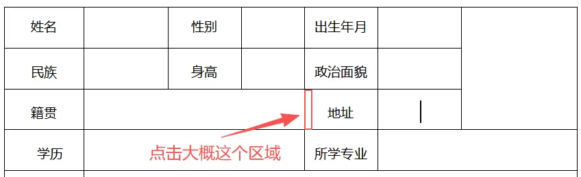 1、想要调整哪个单元格,就把鼠标放在那个单元格的靠左边线的位置或者放在单元格的左下角,当出现一个黑色实心箭头的时候,点击鼠标,选中单元格。例如:我们要调整下面这个表格里头的“地址”,我们就把鼠标放在“地址”单元格里头靠左边线的位置,或者单元格的左下角,然后点击鼠标,选中“地址”单元格。