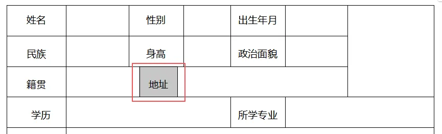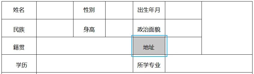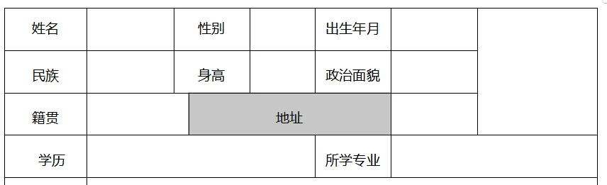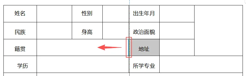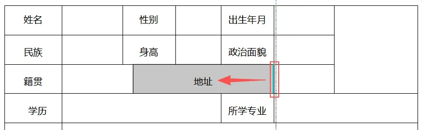 如果想要调整单元格的左右两条边线,就可以在拖动左边线之后,在单元格处于选中状态下,再把鼠标放到右边线上,当鼠标显示成两条竖线加左右黑色箭头时,拖动鼠标到合适的位置,再松开鼠标。例如:在“地址”单元格处于选中状态下,鼠标放在单元格的右边线上,当鼠标显示成两条竖线加左右黑色箭头时,向左拖动鼠标到合适的位置。这样就调整好“地址”单元格的位置,给后面填写内容的单元格留出更大的空间了。