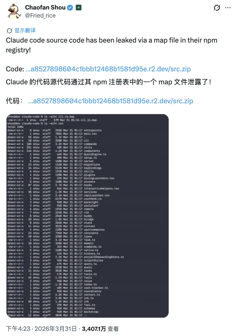 2026年3月31日, 华人安全研究员Chaofan Shou(寿超璠个人主页:https://scf.so) 发现Anthropic公司发布的 Claude Code v2.1.88 版本的 npm 安装包中,错误地包含了一个名为 cli.js.map 的 59.8MB 源码映射文件(Source Map),这直接导致了Claude Code的源代码——1,900多个文件、51.2万行代码,全部以未混淆的形态暴露在公网上。