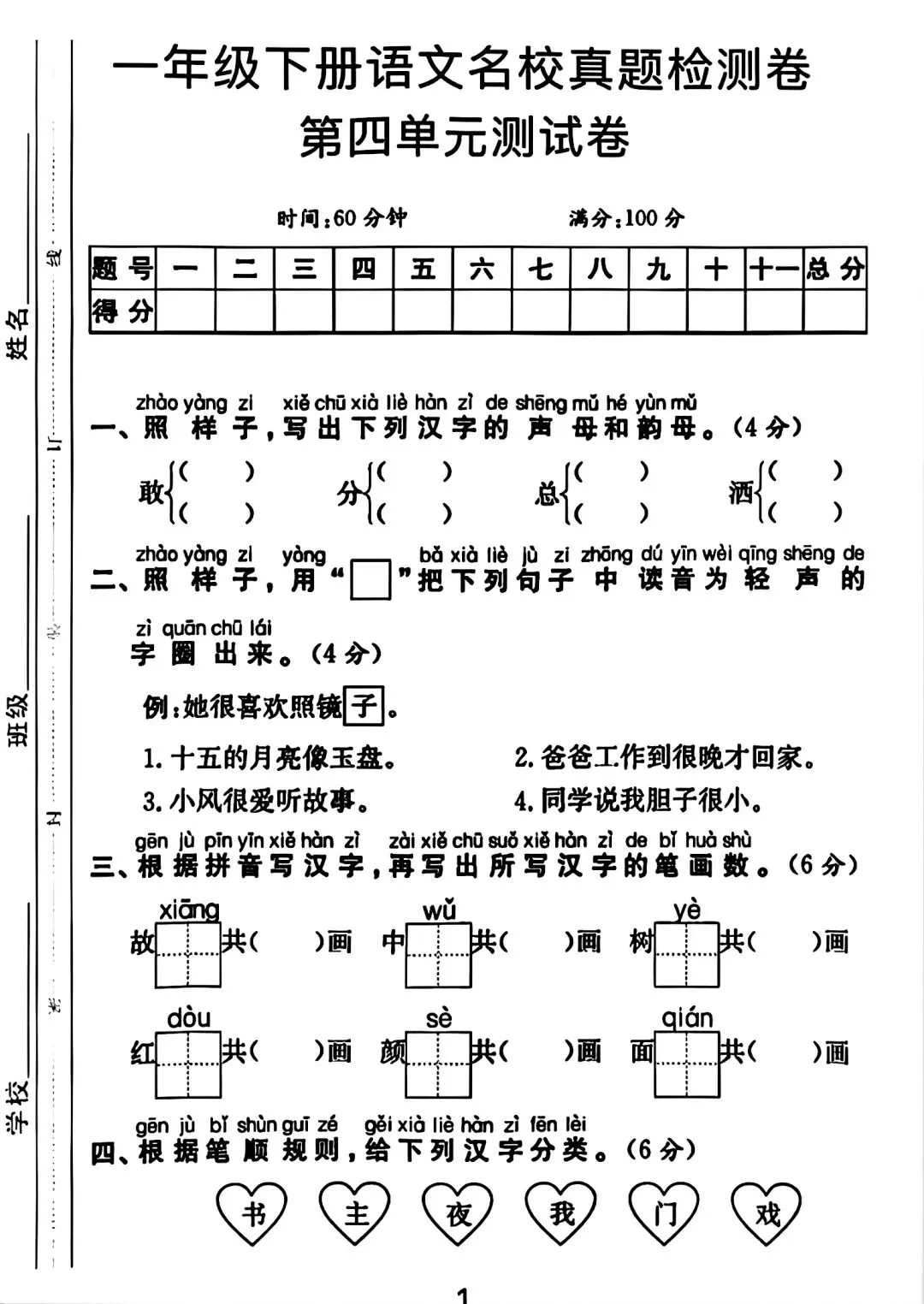 名校真题检测卷侧重基础考查,涵盖声母韵母、轻声字、笔顺分类、形近字、词语句子练习、古诗连线与课内阅读,适合日常单元检测与基础巩固。