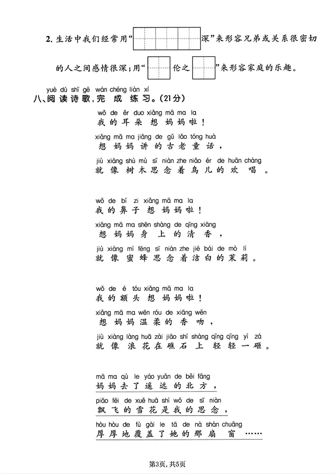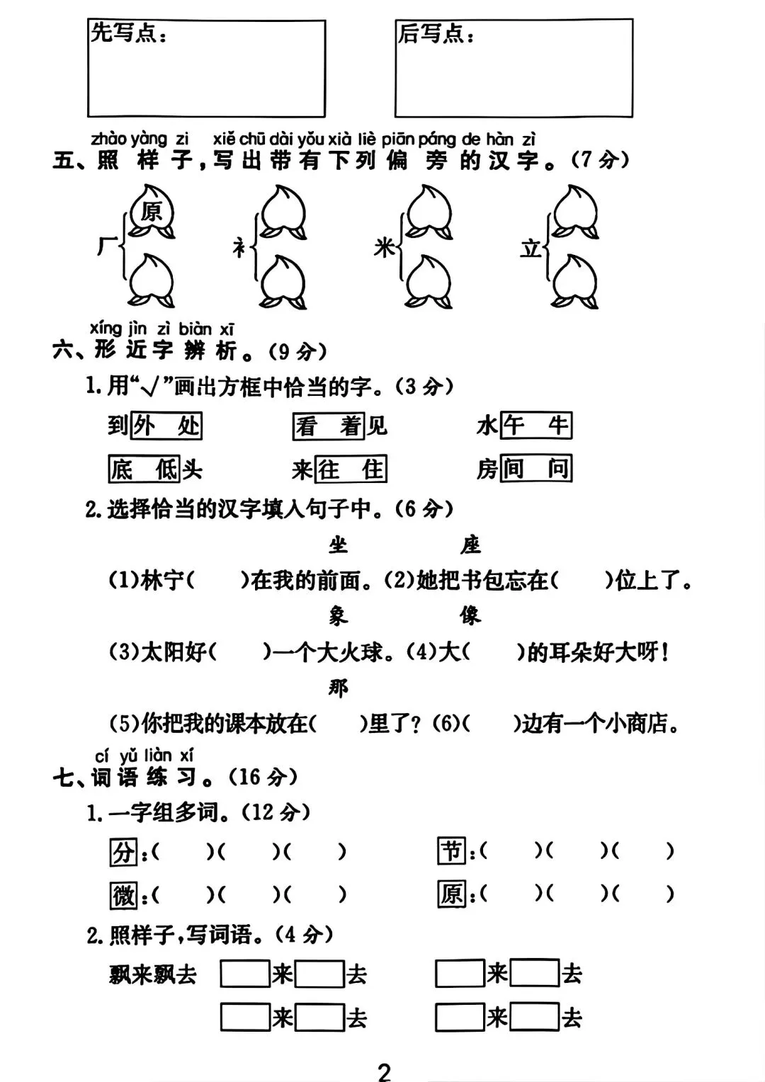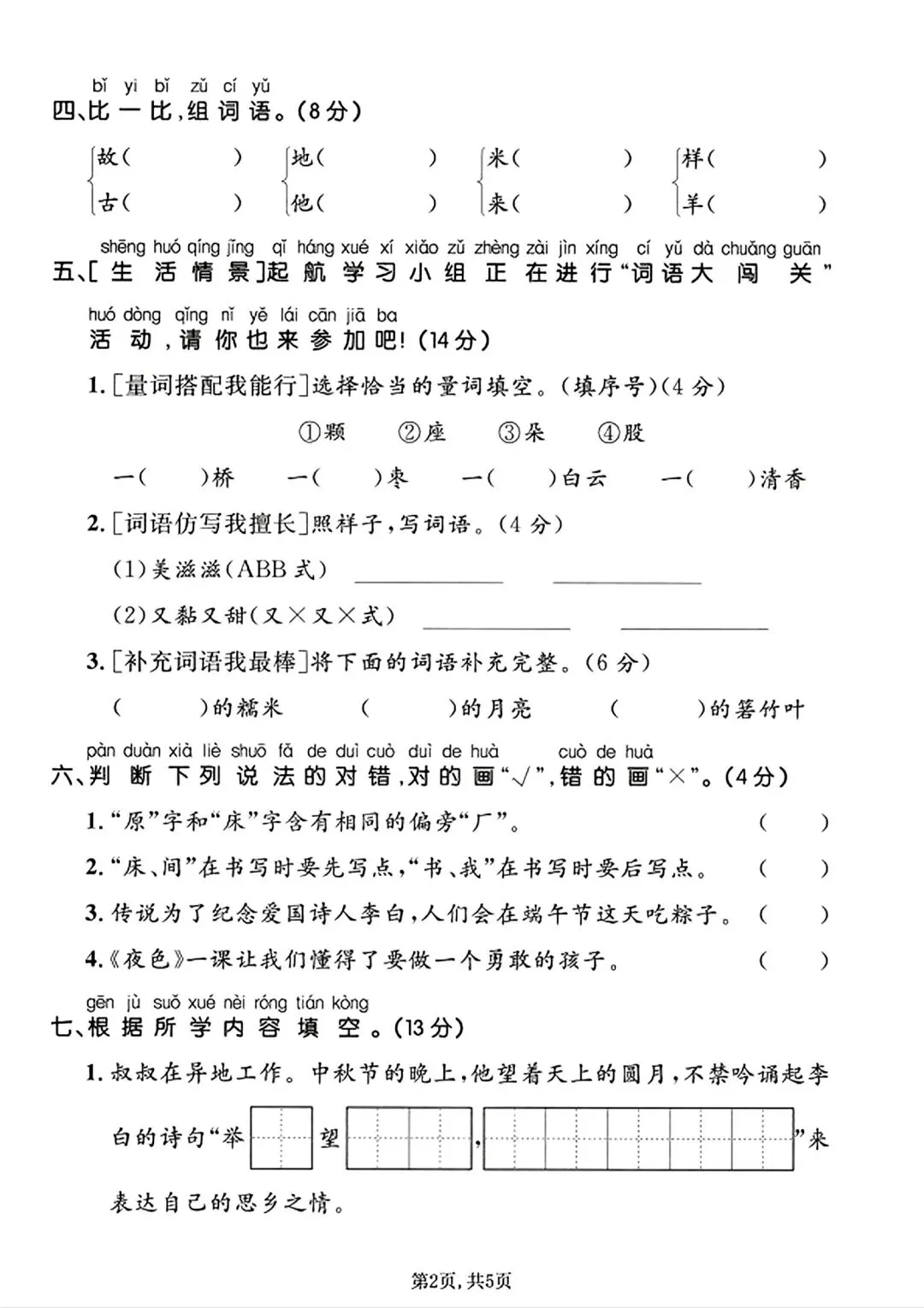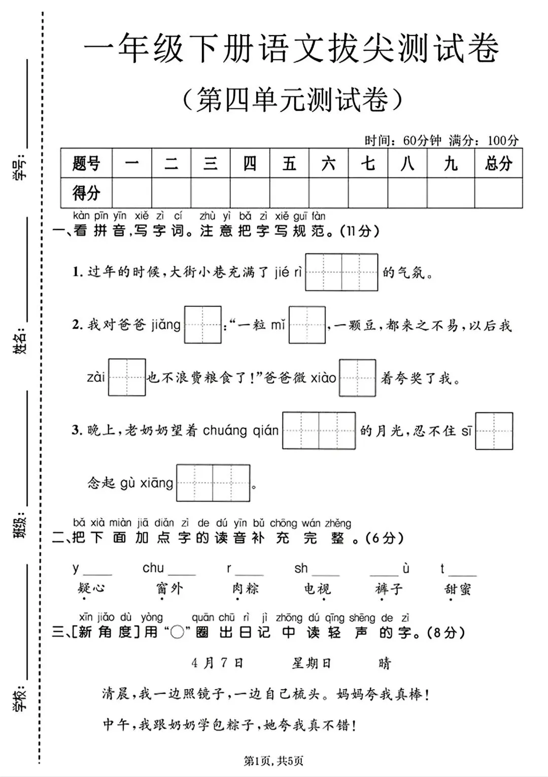 拔尖测试卷难度提升,增加拼音书写、读音补充、量词搭配、词语闯关、诗歌阅读与拓展判断,侧重能力拔高,适合考前冲刺与培优。