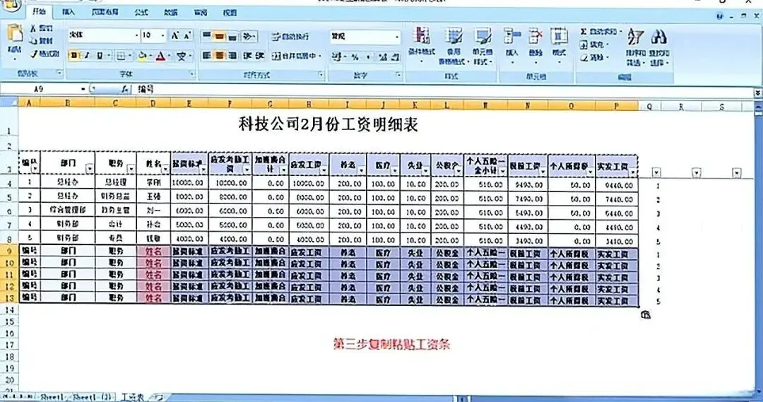 先在所有员工行后面再复制一份员工数据(粘贴N次)