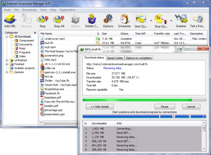 Internet Download Manager(IDM)可提升你的下载速度多达5倍,安排下载时程,或续传一半的软件。Internet Download Manager的续传功能可以恢复因为断线、网络问题、计算机宕机甚至无预警的停电导致下传到一半的软件。此程序具有动态档案分割、多重下载点技术,而且它会重复使用现有的联机,而不需再重新联机登入一遍。聪明的in-speed技术会动态地将所有设定应用到某种联机类型,以充分利用下载速度。