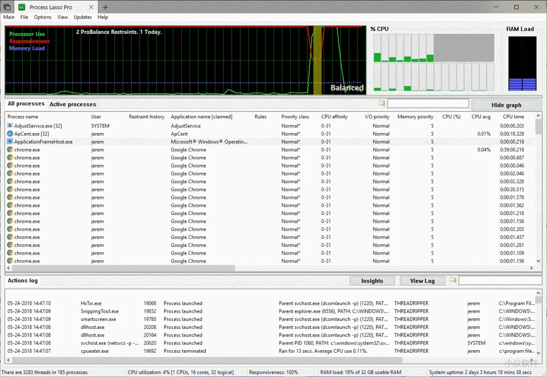 大家有没有遇到这种情况,系统用着用着突然卡了,过几分钟又正常了,这种情况通常是因为系统无法及时调整程序优先级。而 Process Lasso 的 Probalance 能自动平衡进程占用资源,调整 CPU 及进程优先级,保证系统不出现周期性卡顿。而期间用户不需要做任何操作。Process Lasso 还可智能识别 Steam 游戏,自动开启游戏模式,让游戏获得更多系统资源,增加 CPU 利用率、减少磁盘读写等,让游戏体验更流畅 .另外它还针对Adobe全家桶有特别的优化