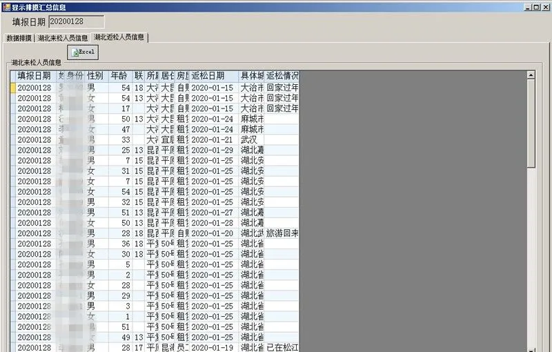 在汇总信息表格中,重点防疫区域来松人员的身份、性别、年龄、住所、返松日期、来自具体城市、返送情况等信息清晰罗列,详实细致。只要输入关键词,便可查询到湖北来松人员的体温情况、监测时间、经办人等具体数据。