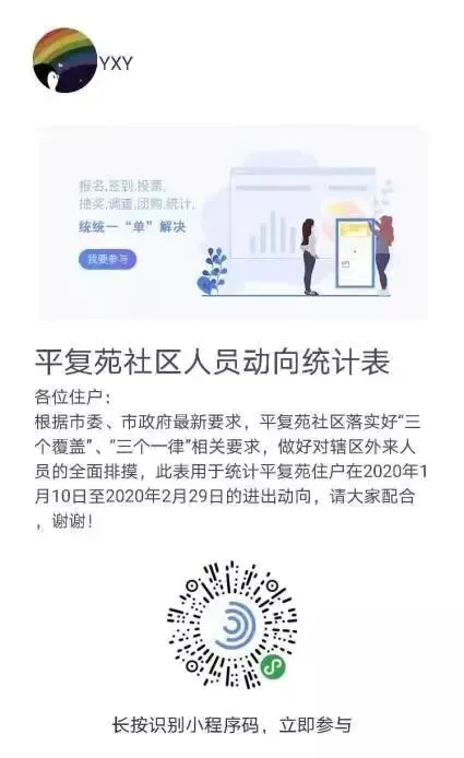 “现在智能手机比较普遍,通过扫描二维码在小程序中填写信息,后台马上就可以看到,既省时又省力,有效推动了摸排工作的开展。”平复苑居民区党总支书记张雷军说道。