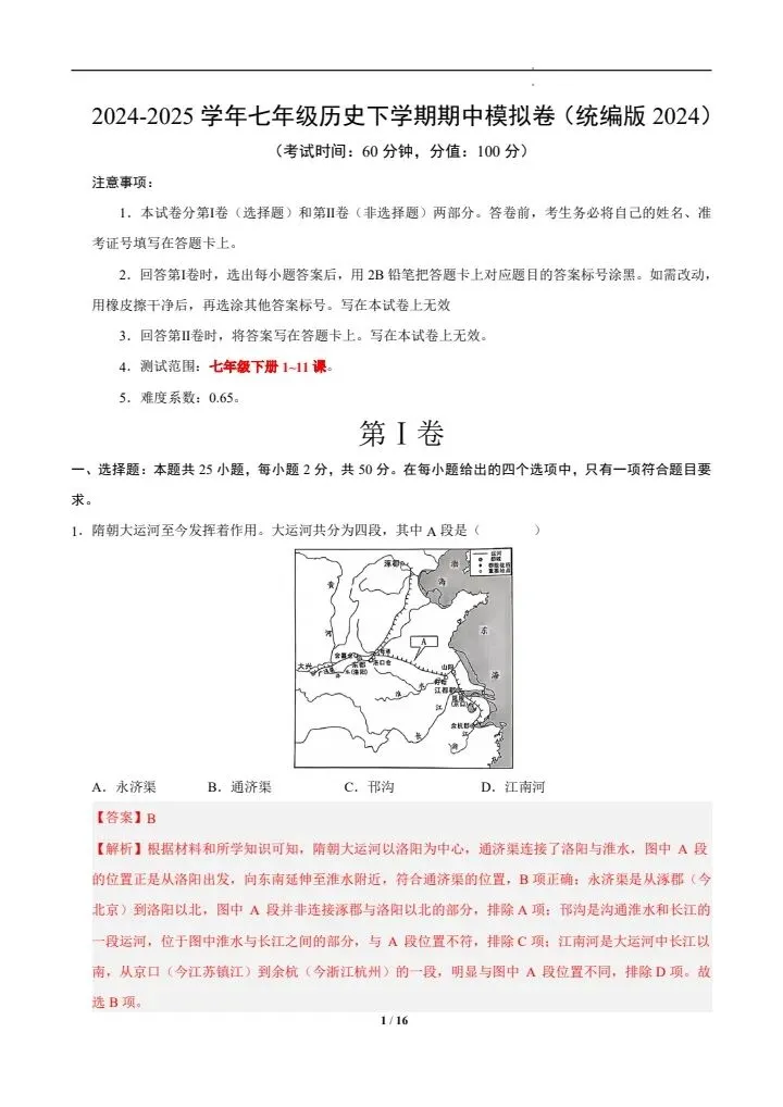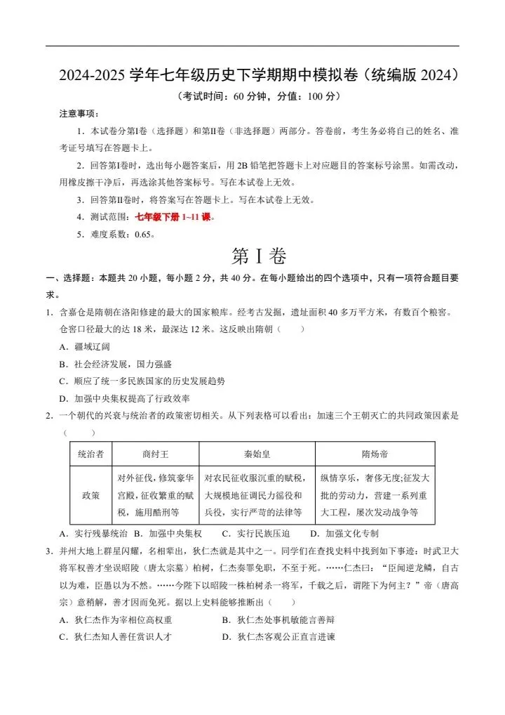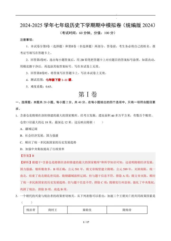 今日分享七年级下册历史期中模拟卷2套含答案(完整电子版可打印)!高清可打印,每日轻量练习,拒绝无效刷题,用系统化资料筑牢学科基础,让假期成为提升的黄金期,开学轻松领跑。