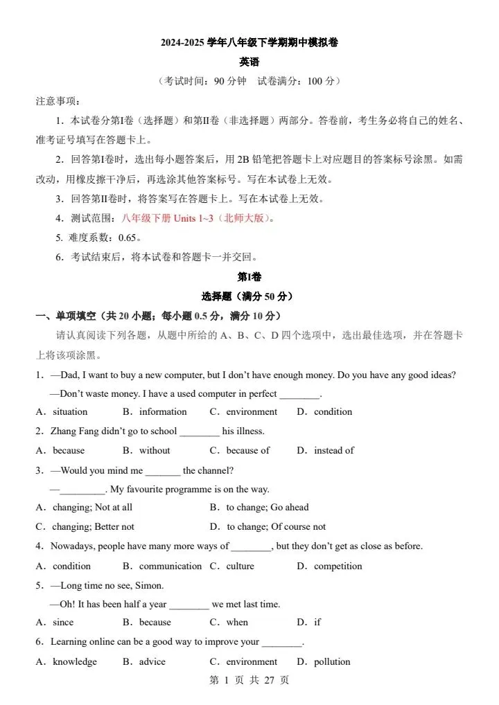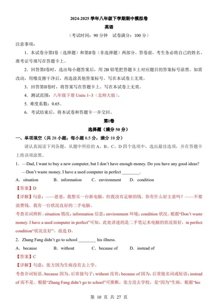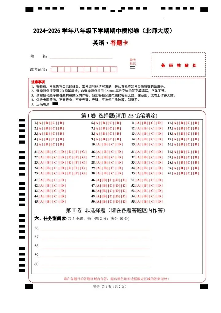今日分享【北师大版】八年级下册英语期中模拟卷(答案+答题卡)完整电子版可打印!高清可打印,每日轻量练习,拒绝无效刷题,用系统化资料筑牢学科基础,让假期成为提升的黄金期,开学轻松领跑。