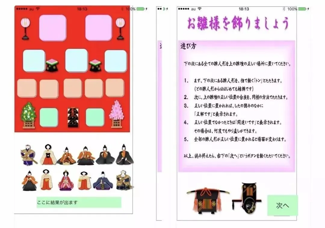 该应用是根据日本每年一度的女儿节的玩偶创建的,玩家可以按照特定的顺序摆放12个观赏玩偶,这些玩偶代表国家的皇帝、家人和客人。若宫雅子说,该游戏需要细细地记住各种的摆放顺序,在年长女性中间特别受欢迎,因为她们可以跟孙子孙女一起玩。