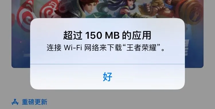 但是用iPhone手机用数据流量下载大于150MB的软件或者游戏就会出现下载不了的情况,会提示连接Wi-Fi网络下载。