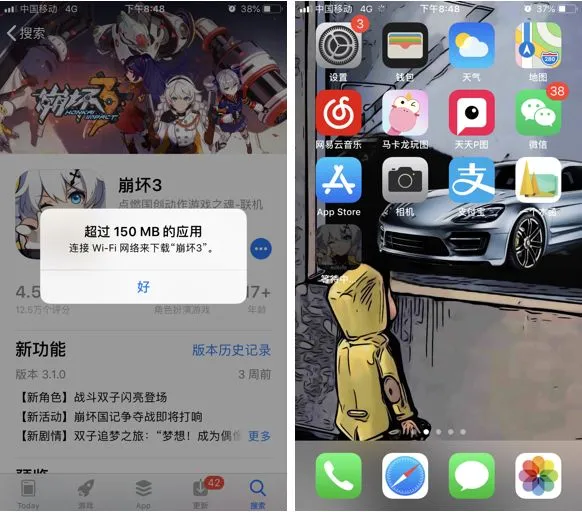 首先打开App Store搜索你需要下载的应用或者游戏,大于150MB的。我们这里搜索崩坏3。这款游戏有2.3GB,所以会有弹窗提示。