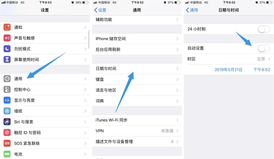 点击【好】,然后回到桌面,打开手机设置–通用–日期与时间–关闭自动设置。