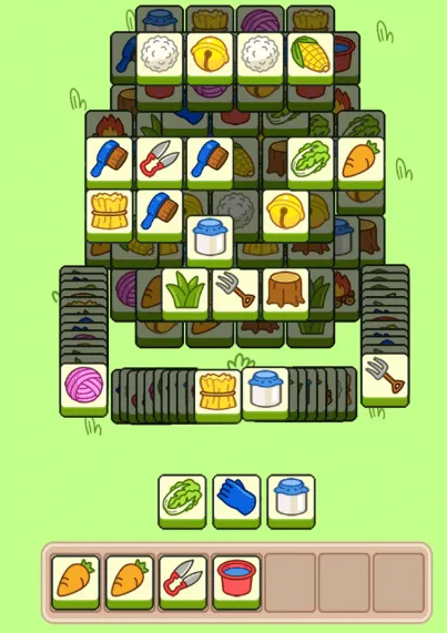 游戏核心为三消机制:下方槽位最多容纳7张牌,点击牌堆中未被覆盖的牌将其放入槽位,集齐三张相同图案即可消除。全部牌消除完毕则通关。
