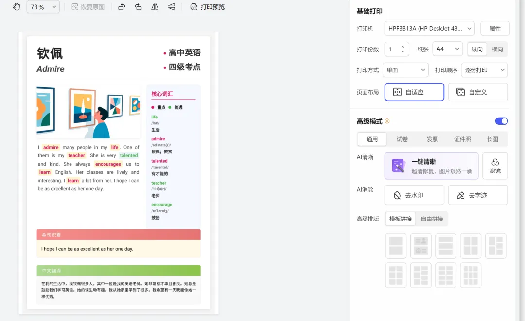 Ctrl+P 调出打印预览,纸张选 A4,缩放选「无」——卡片完美铺满,无留白,无变形。