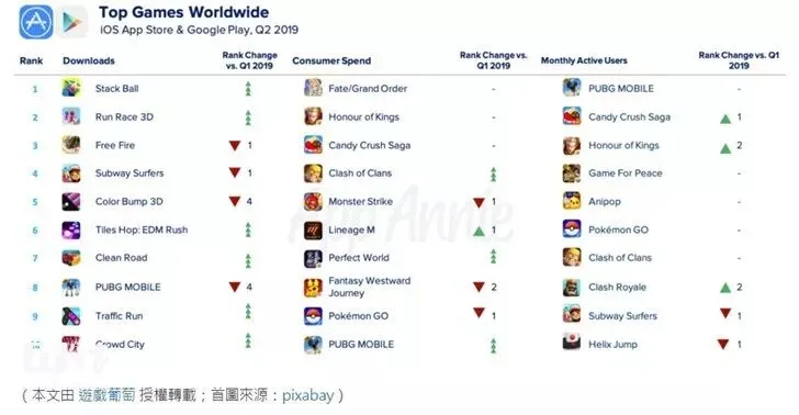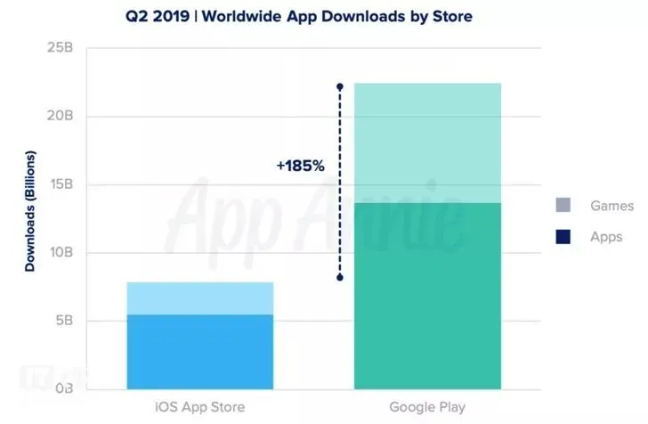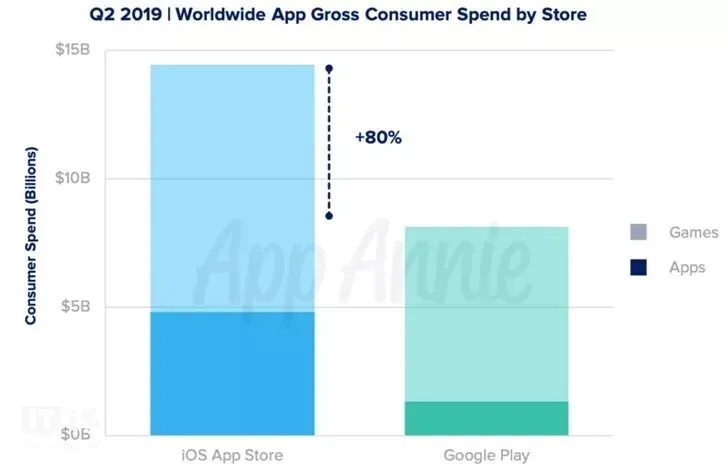 据报告显示,2019年第二季度移动端iOS和Google Play应用软体下载量超过303亿次,用户消费近226亿美元。这其中游戏占全球应用下载量35%;App Store和Google Play两家软件应用商店的游戏消费也占了2019年第二季度全球消费的近75%,