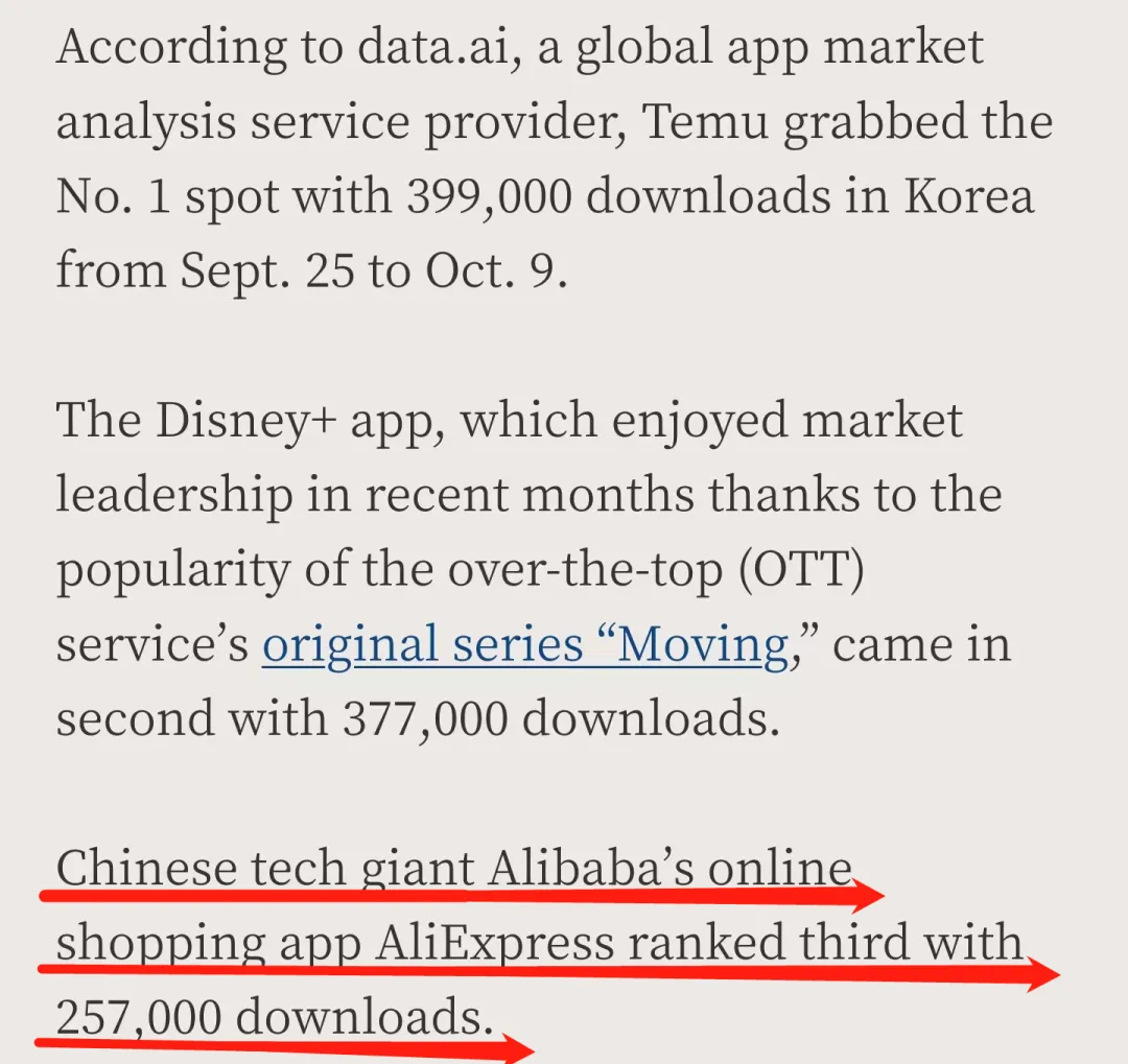 近日,data.ai发布的数据显示,在今年9月25日至10月9日期间,阿里巴巴集团旗下的跨境电商平台速卖通,以25.7万次的下载量,在韩国应用程序下载量排名榜中位于第三。