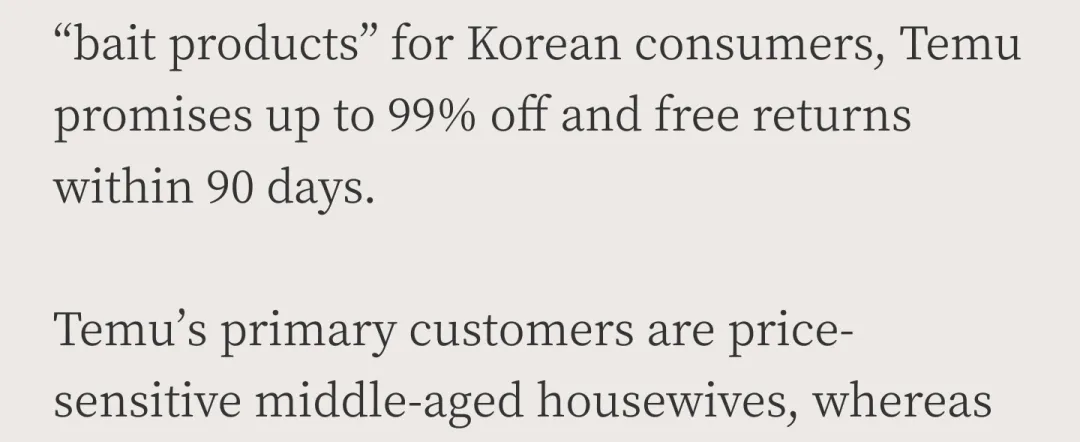 和过去一样,Temu在韩国采取的依旧是低价策略,它向消费者承诺最多99% 的折扣,并提供90 天内免费退货服务。所以,与速卖通主要面向年轻消费群体不同,Temu的主要客户是价格敏感型人群,如中年家庭主妇。在特定的用户群中,Temu备受喜爱。