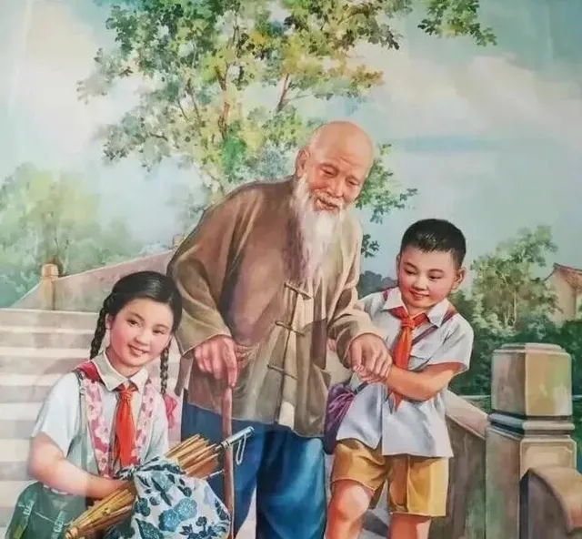 图中这幅色彩鲜亮的画叫老宣传画,不少人教孩子就是靠这些挂墙上的画片,画里小孩扶着老人过桥,身上红领巾鲜得晃眼,站在画前一句话也不用多说,心里就明白什么叫**“尊老爱幼”**,我妈小时候总指着宣传画对我说,见了长辈别装没看见,要懂事儿一些,小时候我在小学教室里,每学期开学新画要挂上墙,孩子们围在前头琢磨图里的故事,谁家里墙角还贴过这种画,心里准留着一份小时候的顺拐劲儿,现在各种动画片看花了眼,反倒少了那点憨厚劲。