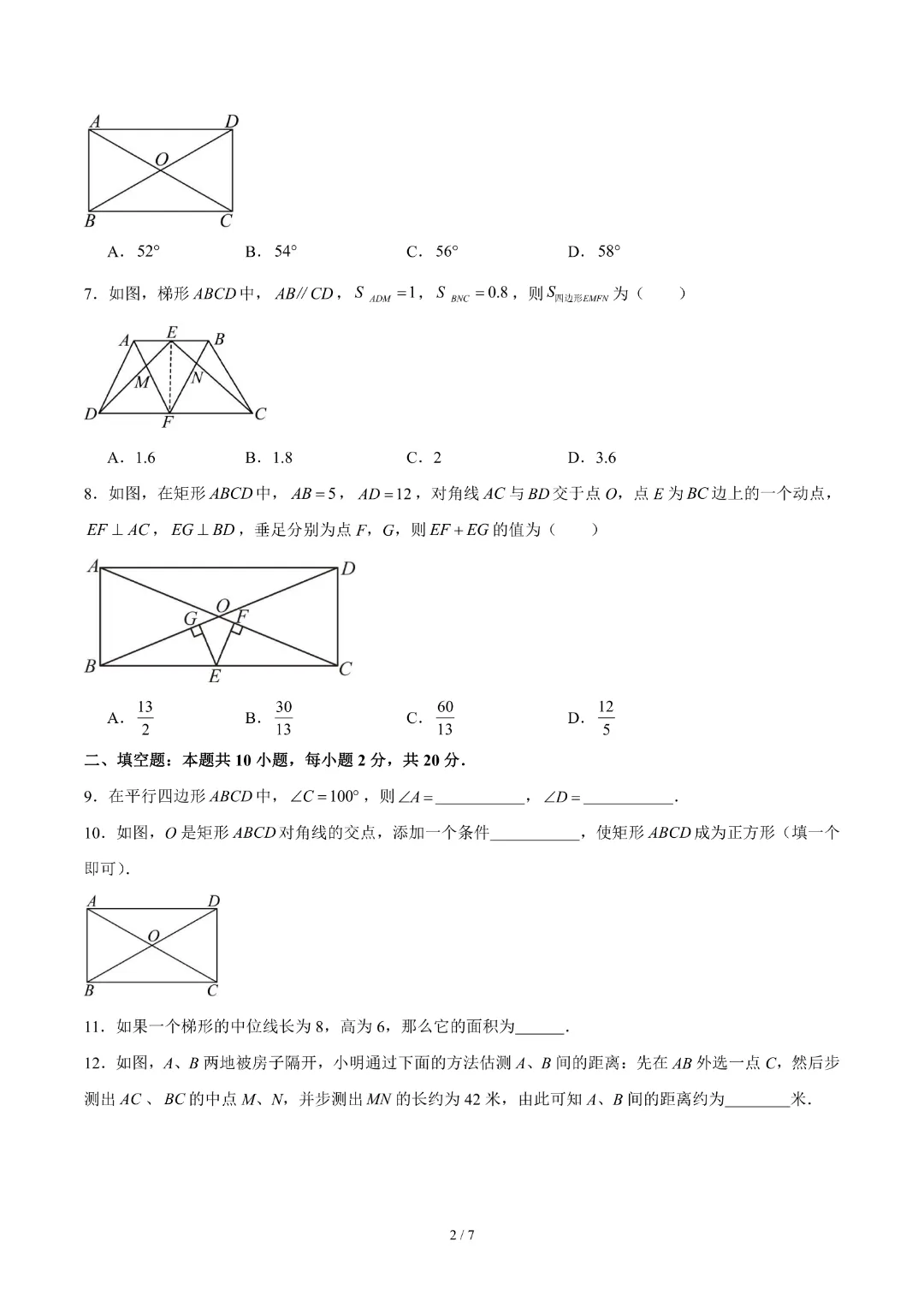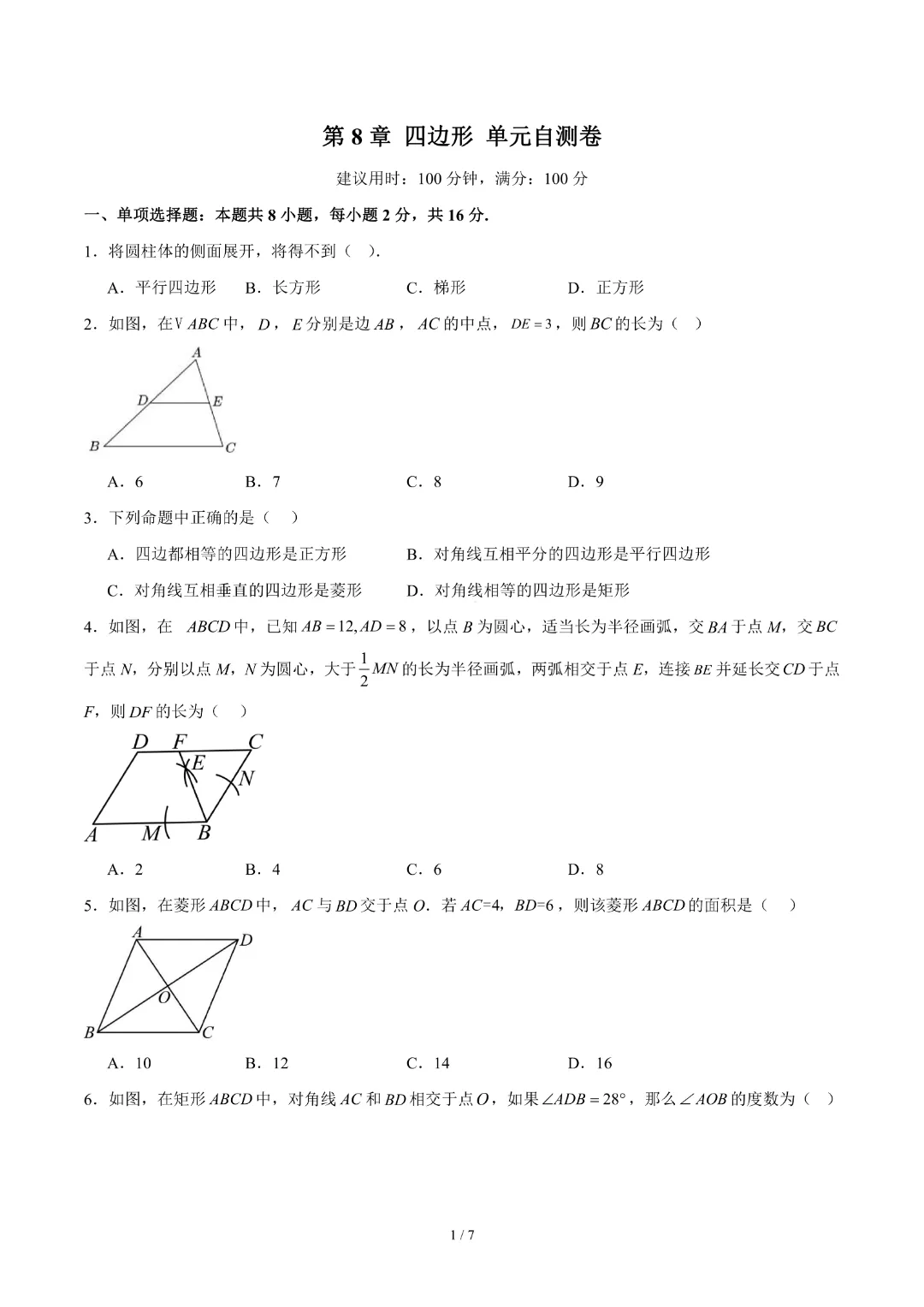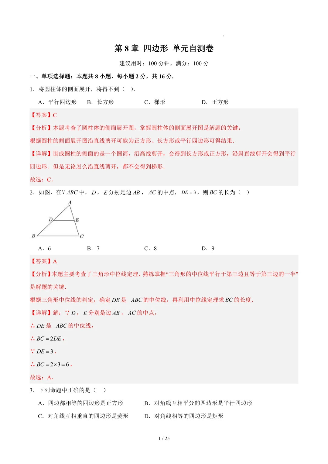 【26春新版八年级下册数学苏科版】初二下册数学《第8章四边形 单元自测卷带答案》丨完整电子版可打印