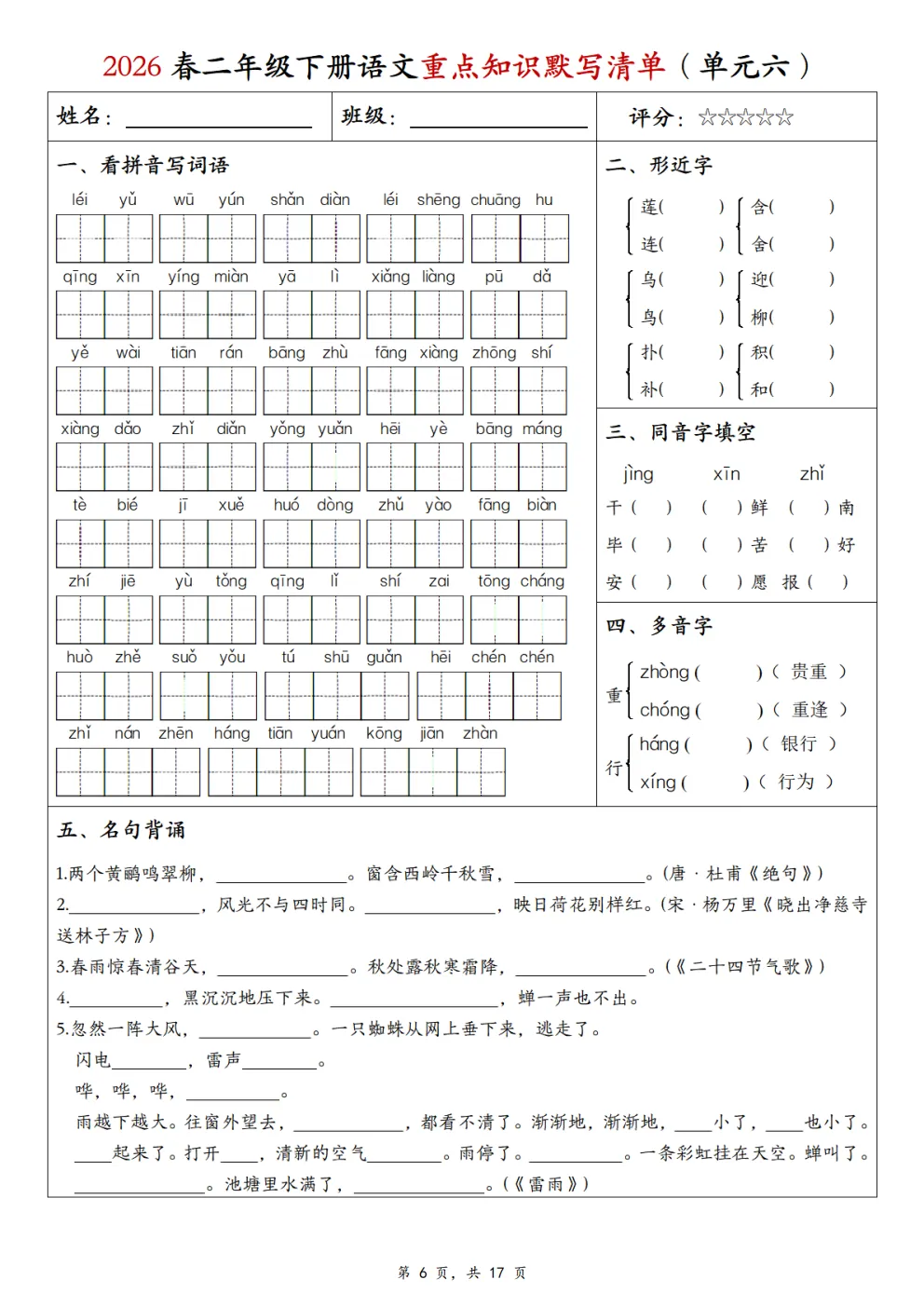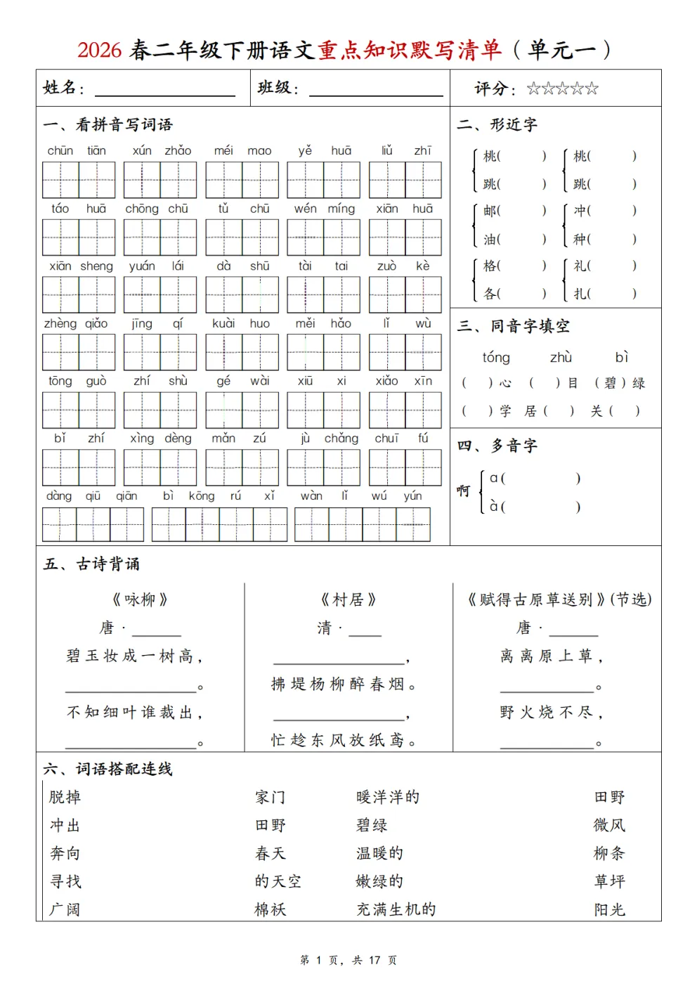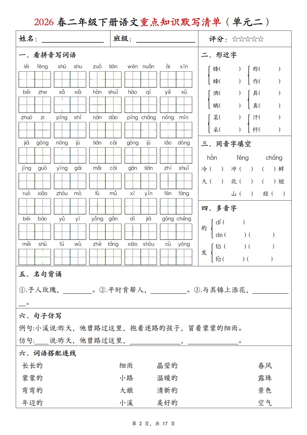 🌟今天给家长们分享的是26春二年级下册人教部编版语文《单元重点知识默写清单》高清电子版可打印,需要的家长抓紧领取一份给孩子打印🖨️出来,让孩子练一练吧✍🏻欢迎分享到班级群或朋友圈,方便家长打印出来助力孩子高效学习!
