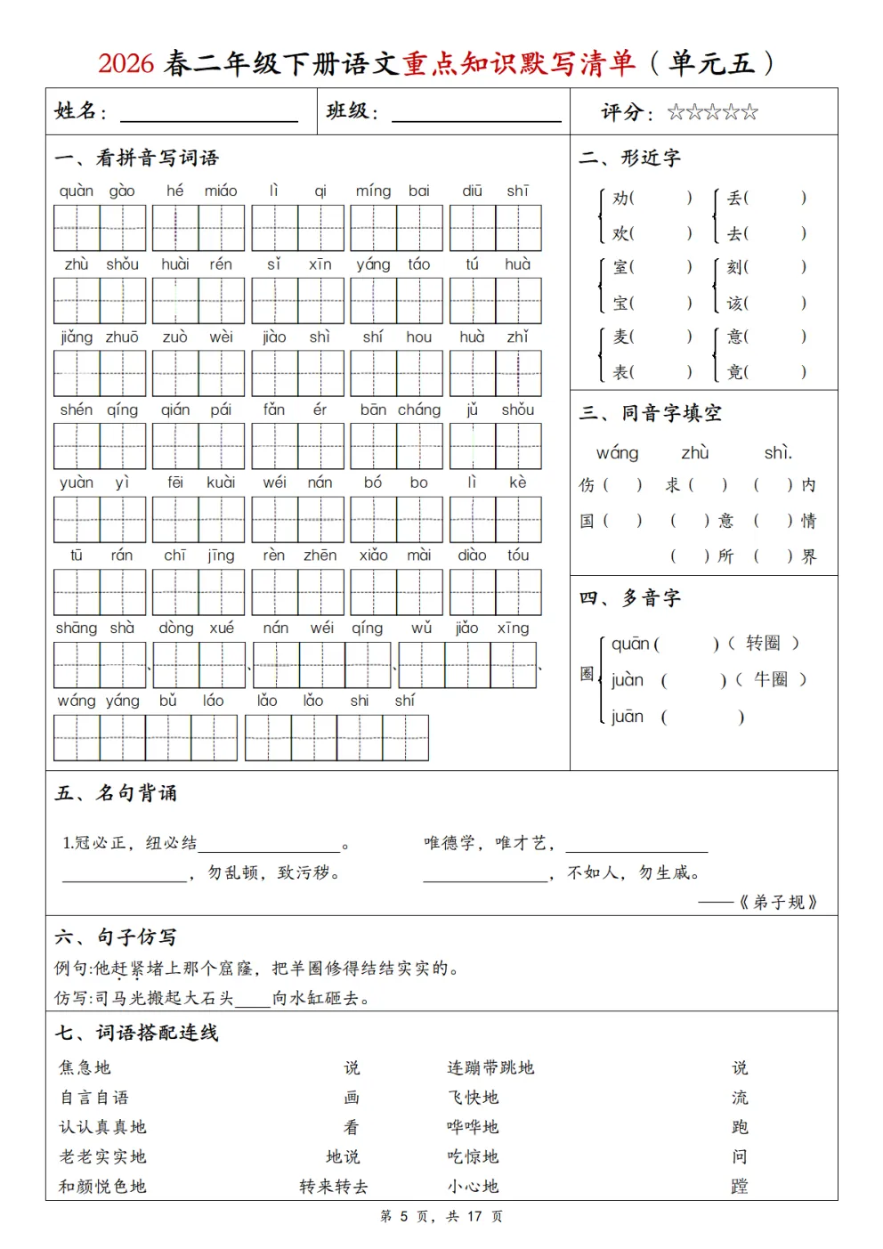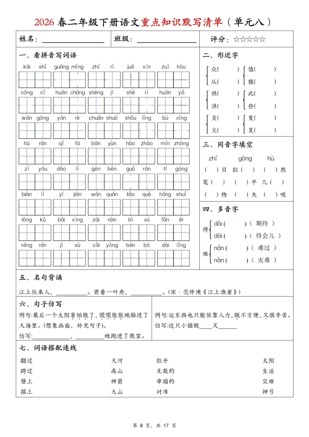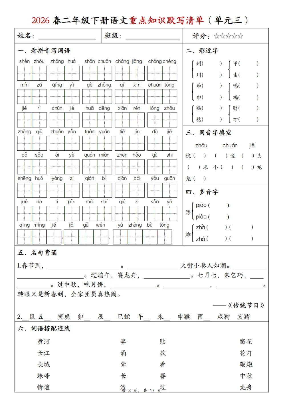 🌟今天给家长们分享的是26春二年级下册人教部编版语文《单元重点知识默写清单》高清电子版可打印,需要的家长抓紧领取一份给孩子打印🖨️出来,让孩子练一练吧✍🏻欢迎分享到班级群或朋友圈,方便家长打印出来助力孩子高效学习!