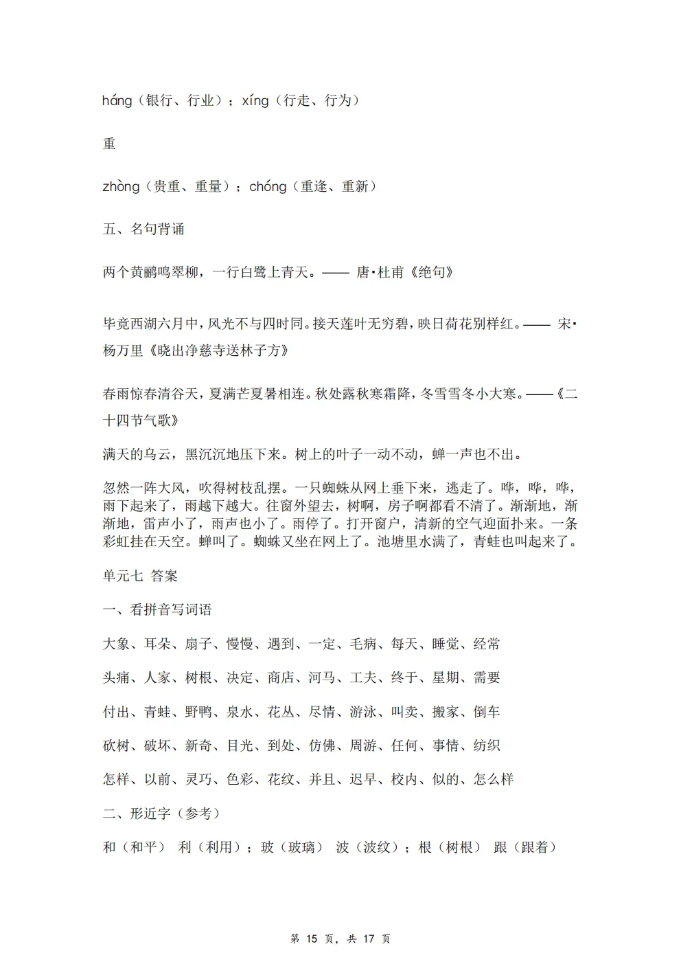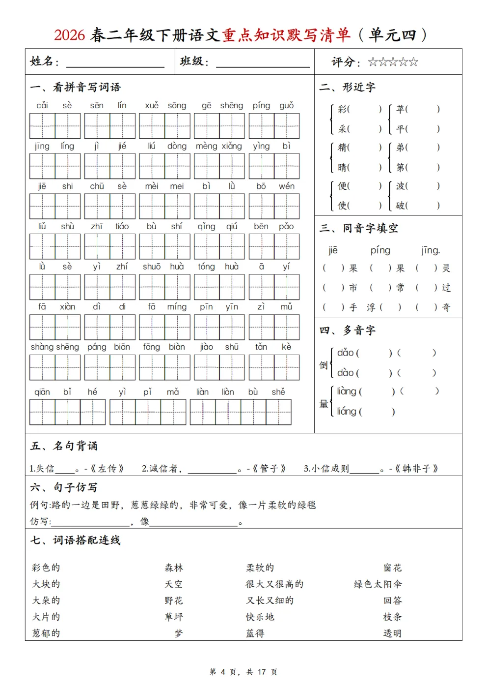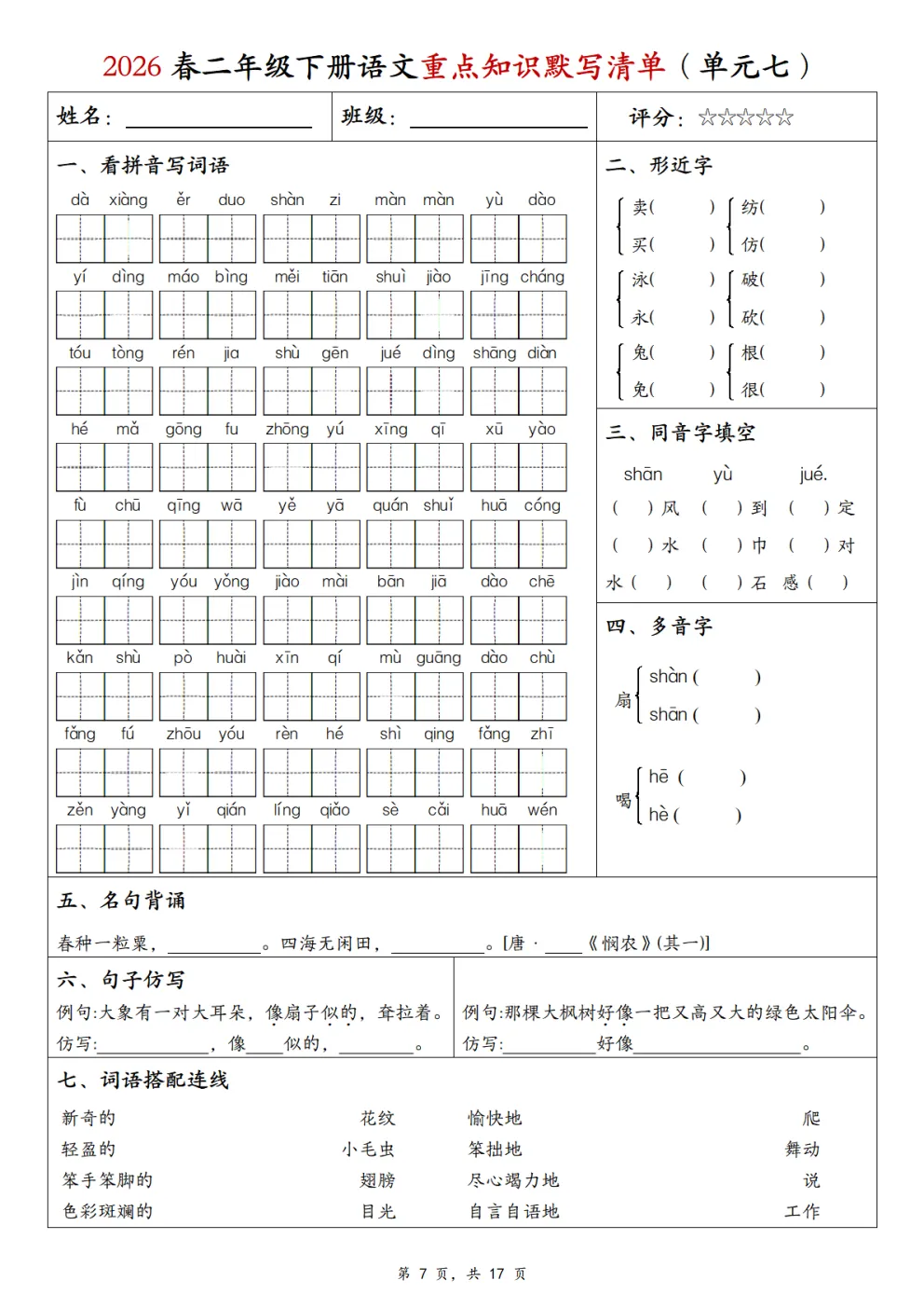 26春二年级下册人教部编版语文《单元重点知识默写清单》高清可打印