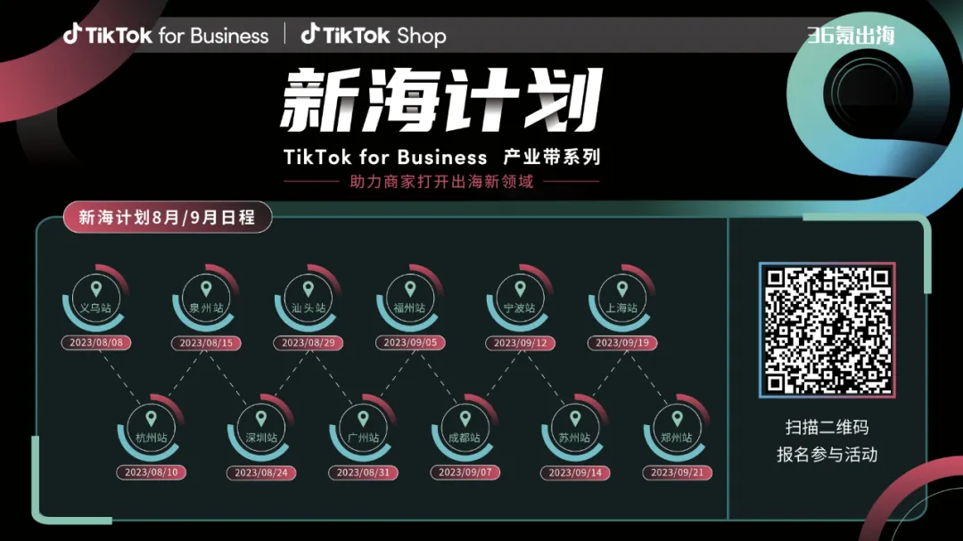 本轮投资方包括 Generative Ventures、北极光创投和险峰长青。据了解,Aegis 成立于2022年,孵化自另一家全球化区块链安全公司「派盾」。公司 CEO 表示,Aegis 这款产品打造一个低门槛的安全平台,服务众多的 Web3 C 端用户,当前该产品以插件形式存在于浏览器中,提供交易事前、事中、事后环节的防护功能。公司的目标市场主要在北美与东南亚,目前已有14万用户量。(36氪)产业带巡回活动|8月、9月日程已发布,新海计划火热进行中TikTok for Business 新海计划现已启动,活动将携手 TikTok Shop 以及产业上下游资深专家组成“新海导师联盟”,针对出海过程中的实际运营痛点与需求,以产业带线下交流活动的形式,为0-1独立站卖家、平台卖家、外贸工厂及品牌卖家提供全链路、多维度的出海指导。新海计划自8月开始,将来到深圳、汕头、广州、福州、成都、宁波、苏州、上海、郑州等城市,举办不同品类和主题的线下活动。欢迎扫描下方二维码,根据表单中的日期与城市信息,报名参加活动。由于参会名额有限,我们会对报名进行审核,优先广大商家参与,并对通过审核的参会者发送通知。Let’s出海 Talks|出海中东系列讲座第一季36氪出海正式推出“出海中东”系列讲座第一季。我们邀请到4位重磅嘉宾,他们将围绕“本地企业视角”、“出海合规风险”、“中东创投机遇”以及“营商环境解读”4个主题,分享最一线的洞察和经验。7月25日-8月29日,周二下午2点,活动将通过 Zoom 举办,仅针对“出海中东”社群成员开放。我们会在每次讲座前一天,在社群中分享会议链接。如果您对中东市场感兴趣,欢迎扫码填写表单、加入“出海中东”社群。在通过审核后,我们的工作人员会协助您参与讲座,进行互动交流。
