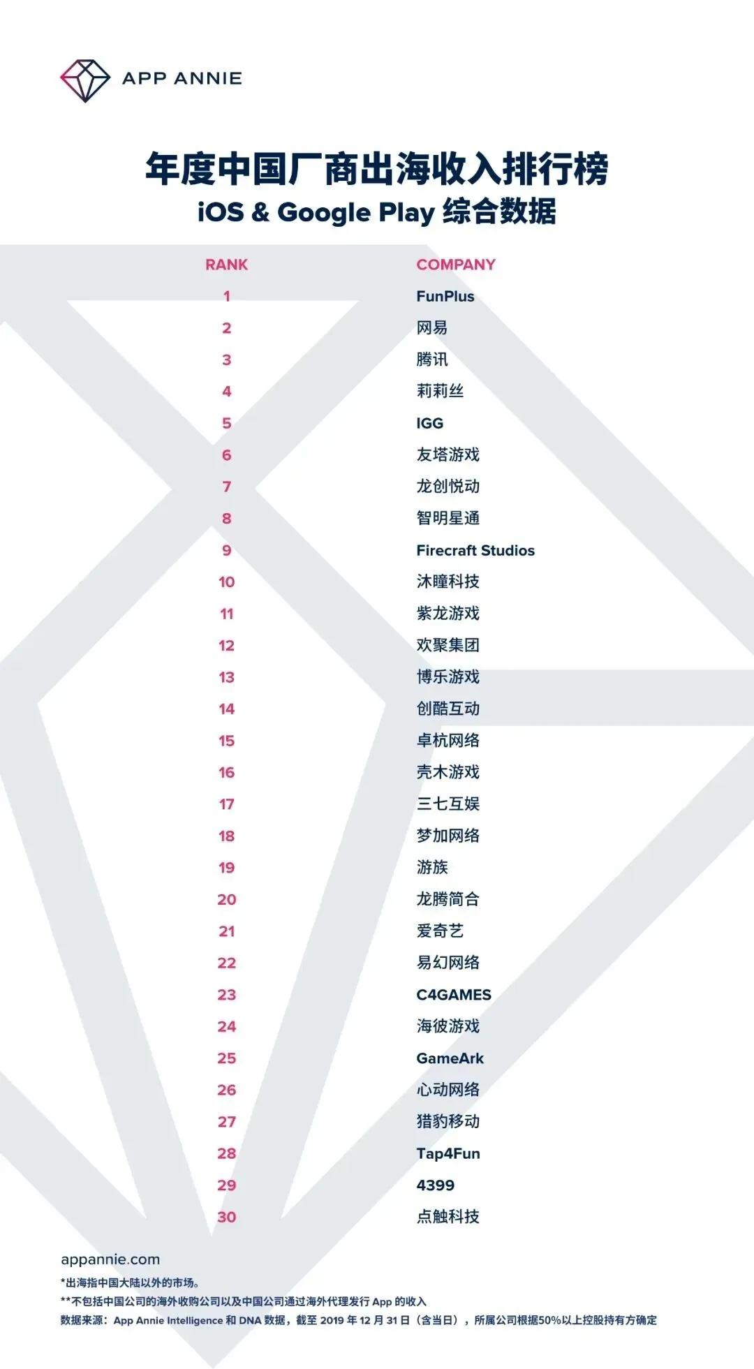 近日,App Annie发布了 2019 年度全球 App 发行商收入排行榜 TOP52和2019 年度中国出海厂商 TOP30,从海外市场的收入以及下载量两个维度各选出了表现最为出色的厂商。