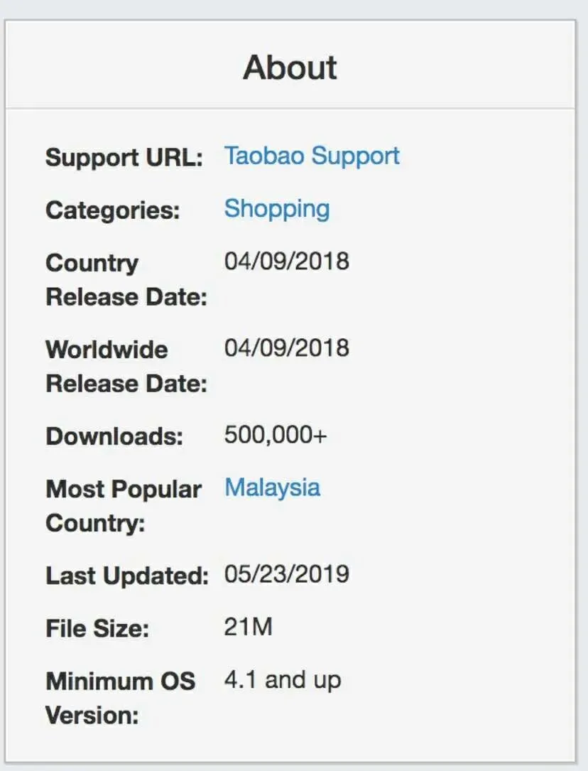 另外,根据Sensor Tower 数据,目前“淘宝特价版”在美国谷歌安卓应用商店的下载量已经超过50万,但最近一次更新还在2019年5月。