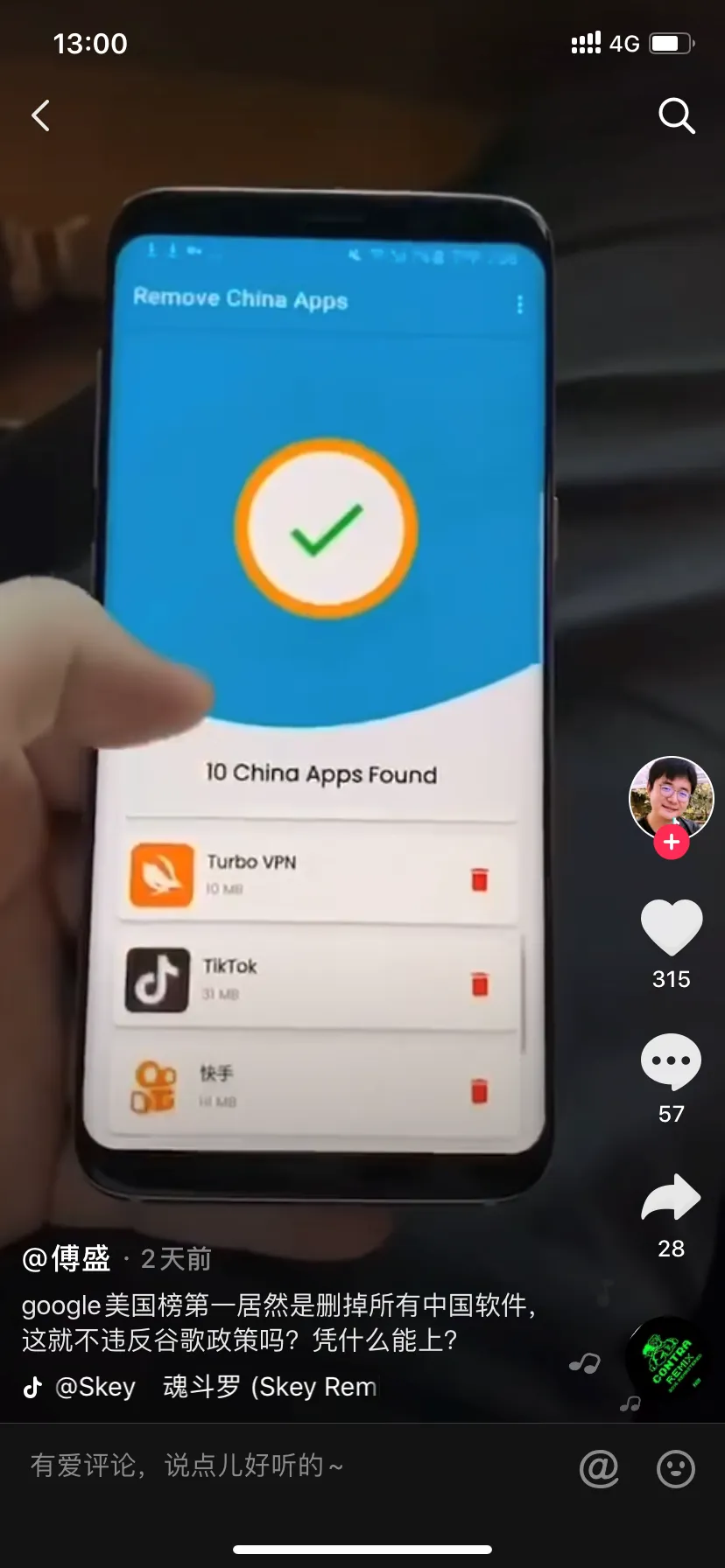 对于这款能够干扰其他App正常运行的应用,也不是没有人质疑的。猎豹移动公司的CEO傅盛就在其抖音账号上发布一段关于“Remove China Apps”的视频,并表示这款软件凭什么能上架谷歌,难道不违反谷歌的政策吗?
