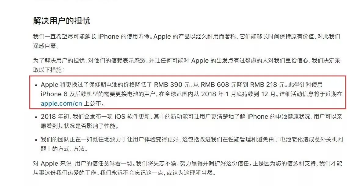 苹果目前只给出了一个降低更换电费用的相关方案,详细的信息还没有公布。不过按照小编的理解,即使不在保修期了,iPhone6及后续的机型都能满足低价更换电池的要求,毕竟还有要花自己的钱的。