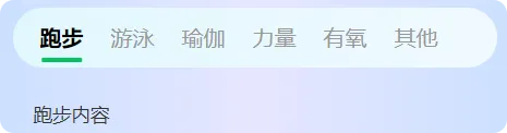 <template><viewclass="page-wrapper"><viewclass="tab-container tab-container-3"><viewclass="tab-list"><viewv-for="(item, index) in tabList":key="index"class="tab-item":class="{ active: currentIndex === index }" @click="switchTab(index)"> {{ item.name }}</view></view></view><viewclass="content-container"><viewv-show="currentIndex === 0">跑步内容</view><viewv-show="currentIndex === 1">游泳内容</view><viewv-show="currentIndex === 2">瑜伽内容</view><viewv-show="currentIndex === 3">力量内容</view><viewv-show="currentIndex === 4">有氧内容</view><viewv-show="currentIndex === 5">其他内容</view></view></view></template><script>export default { data() {return {tabList: [ { name: '跑步' }, { name: '游泳' }, { name: '瑜伽' }, { name: '力量' }, { name: '有氧' }, { name: '其他' } ],currentIndex: 0 } },methods: { switchTab(index) {this.currentIndex = index } }}</script><stylescoped>.page-wrapper {width: 100%;min-height: 100vh;padding: 20rpx;box-sizing: border-box;background: linear-gradient(90deg, #cce0ff 0%, #e6e6ff 50%, #cce0ff 100%);}.tab-container {display: flex;align-items: center;padding: 020rpx;height: 88rpx;border-radius: 44rpx;margin-bottom: 20rpx;background: linear-gradient(to right, #e1f7fe, #f0f9ff);}.tab-list {display: flex;align-items: center;flex: 1;overflow-x: auto;white-space: nowrap;}.tab-item {font-size: 32rpx;font-weight: 500;color: #999;padding: 020rpx;line-height: 88rpx;position: relative;transition: all 0.3s ease;flex-shrink: 0;}.tab-item.active {font-weight: bold;color: #000;}.tab-item.active::after {content: '';position: absolute;bottom: 8rpx;left: 50%;transform: translateX(-50%);width: 60rpx;height: 6rpx;background: #07c160;border-radius: 3rpx;}.content-container {padding: 30rpx;font-size: 28rpx;color: #333;}</style>
