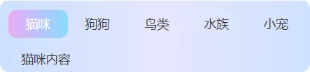 <template><viewclass="page-wrapper"><viewclass="tab-container tab-container-6"><viewclass="tab-list"><viewv-for="(item, index) in tabList":key="index"class="tab-item":class="{ active: currentIndex === index }" @click="switchTab(index)"> {{ item.name }}</view></view></view><viewclass="content-container"><viewv-show="currentIndex === 0">猫咪内容</view><viewv-show="currentIndex === 1">狗狗内容</view><viewv-show="currentIndex === 2">鸟类内容</view><viewv-show="currentIndex === 3">水族内容</view><viewv-show="currentIndex === 4">小宠内容</view></view></view></template><script>export default { data() {return {tabList: [ { name: '猫咪' }, { name: '狗狗' }, { name: '鸟类' }, { name: '水族' }, { name: '小宠' } ],currentIndex: 0 } },methods: { switchTab(index) {this.currentIndex = index } }}</script><stylescoped>.page-wrapper {width: 100%;min-height: 100vh;padding: 20rpx;box-sizing: border-box;background: linear-gradient(90deg, #cce0ff 0%, #e6e6ff 50%, #cce0ff 100%);}.tab-container {background: transparent;padding: 0;}.tab-list {display: flex;align-items: center;flex: 1;overflow-x: auto;white-space: nowrap;}.tab-item {color: #333;padding: 040rpx;line-height: 66rpx;font-size: 28rpx;transition: all 0.3s ease;flex-shrink: 0;}.tab-item.active {color: #ffffff;background: linear-gradient(to right, #e9abf4, #87daff);border-radius: 20rpx;}.content-container {padding: 30rpx;font-size: 28rpx;color: #333;}</style>
