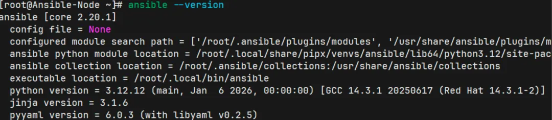 输出示例:ansible [core 2.20.1],Python 3.12.12,Jinja 3.1.6