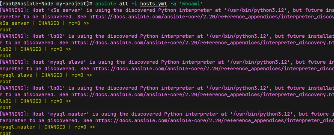 ansible all -i hosts.yml -a 'whoami'