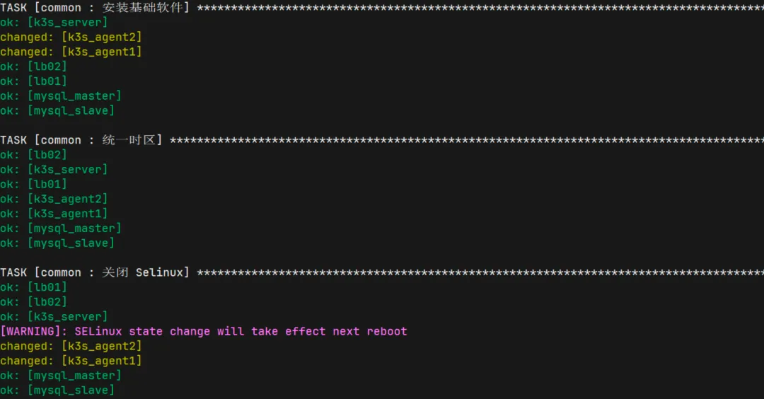 - name: 安装基础软件ansible.builtin.package:name: [vim, tree, net-tools, tmux]state: presentupdate_cache: yes- name: 统一时区community.general.timezone:name: Asia/Shanghai- name: 关闭SELinuxansible.posix.selinux:state: disabled