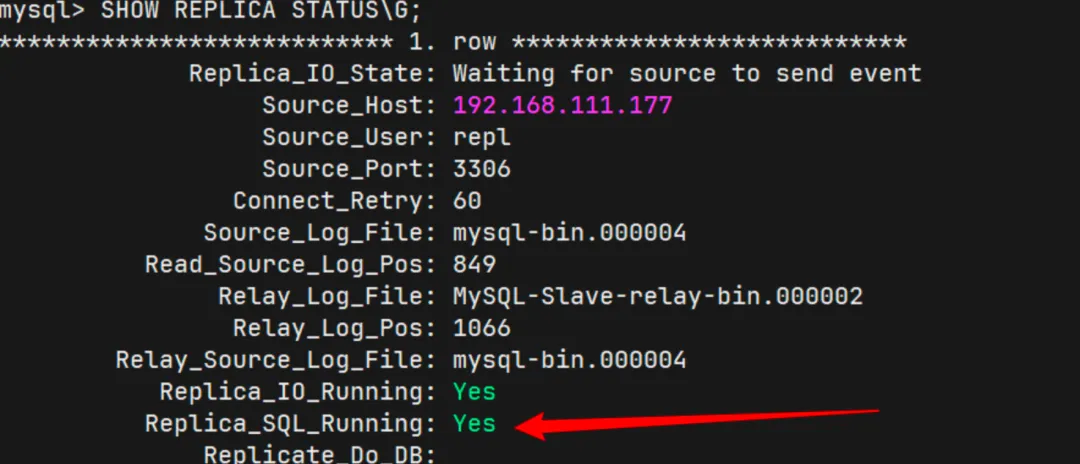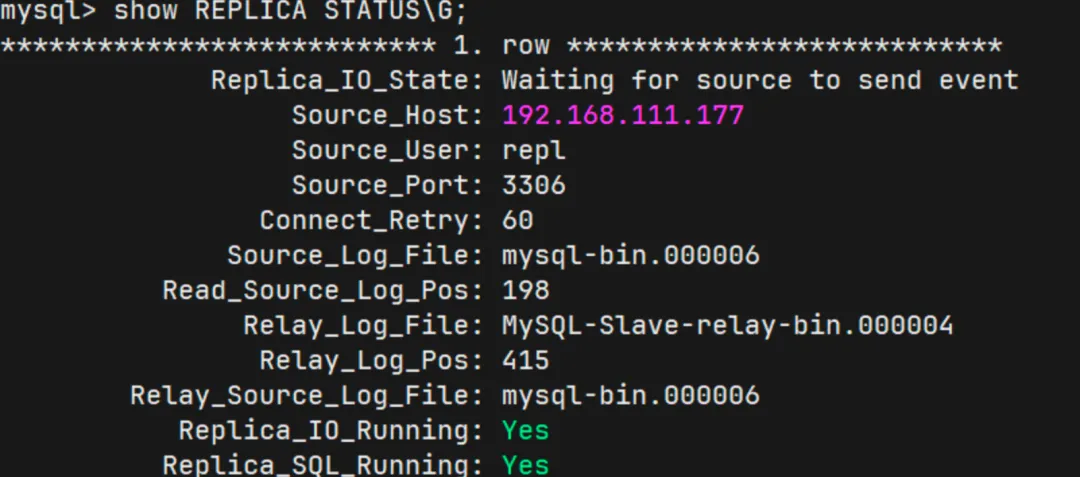 STOP REPLICA;CHANGE REPLICATION SOURCE TOSOURCE_HOST='192.168.111.177',SOURCE_USER='repl',SOURCE_PASSWORD='Admin_123!',SOURCE_PORT=3306,SOURCE_AUTO_POSITION=1,SOURCE_SSL=1;START REPLICA;