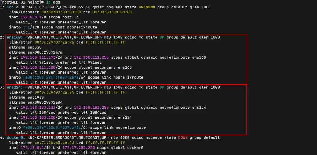 global_defs { router_id Master }vrrp_script check_nginx { script "killall -0 nginx"; interval 2; weight -20 }vrrp_instance VI_1 {state MASTERinterface ens224virtual_router_id 51priority 100advert_int 1authentication { auth_type PASS; auth_pass Admin123 }virtual_ipaddress { 192.168.183.100 }track_script { check_nginx }}