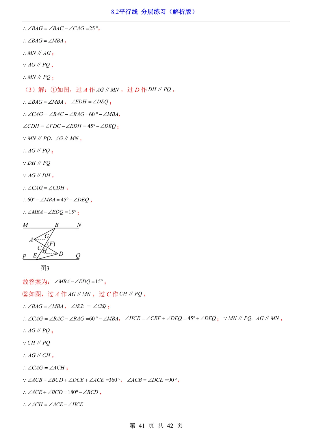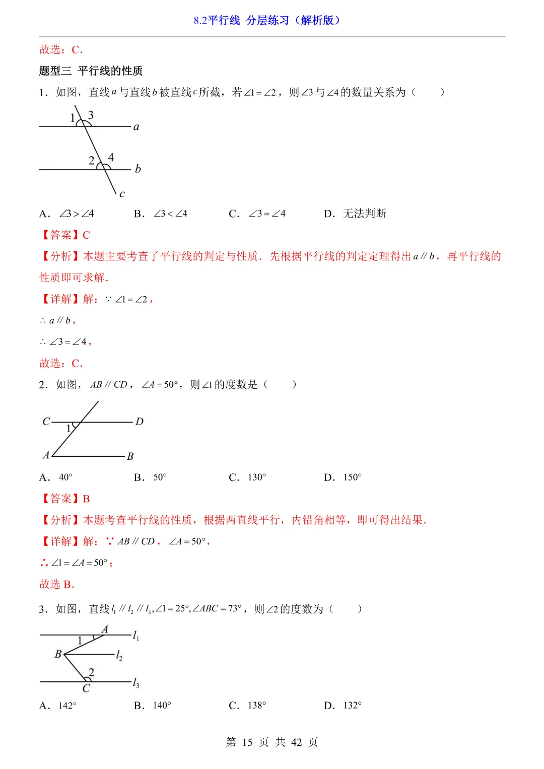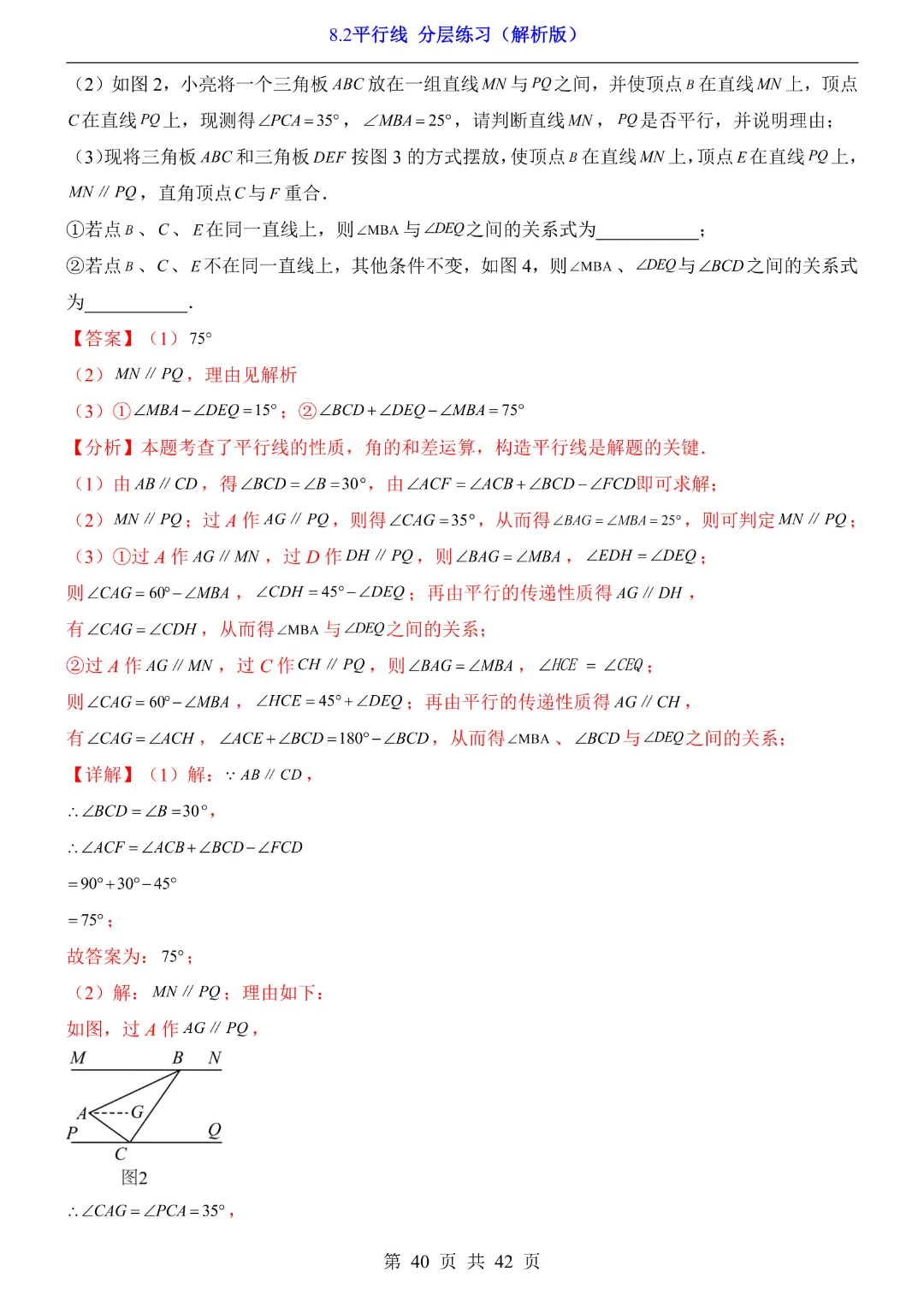 【七年级下册数学】【青岛版】8.2平行线 分层练习附解析 40页-高清电子版可打印