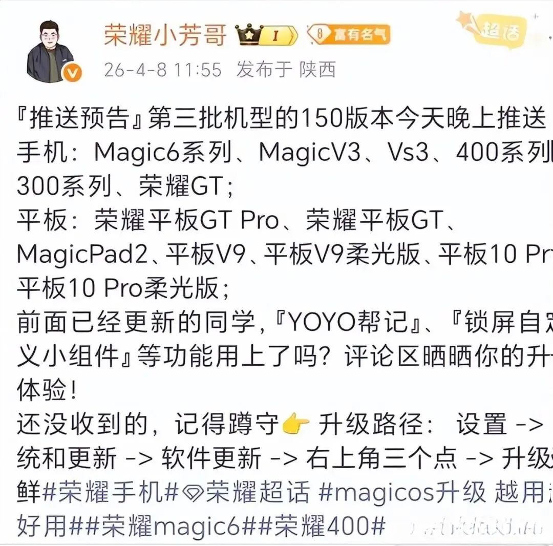 用户也早已接受这套逻辑:新机买的是体验,老机只配当备用。但荣耀这次直接掀翻了这套规则——为Magic6、荣耀300、荣耀GT、Magic V3等多机型推送150版本,不是象征性优化,而是把续航调度、灵动胶囊等旗舰级体验直接下放。