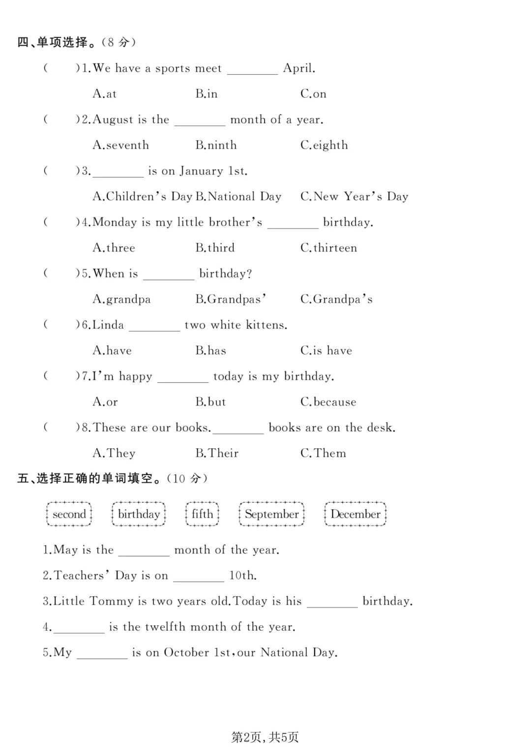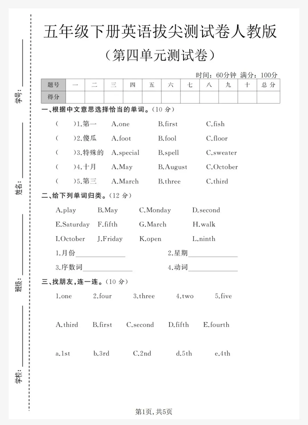 人教pep版 | 五年级下册 英语《 第四单元拔尖测试卷 》附答案 可下载打印